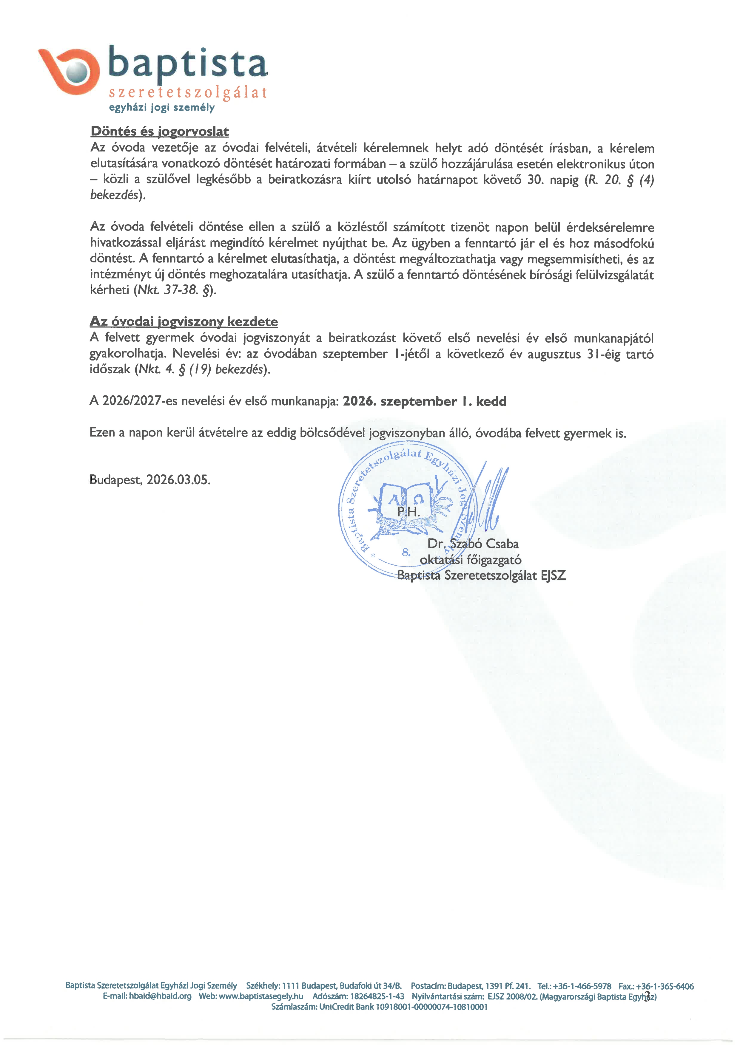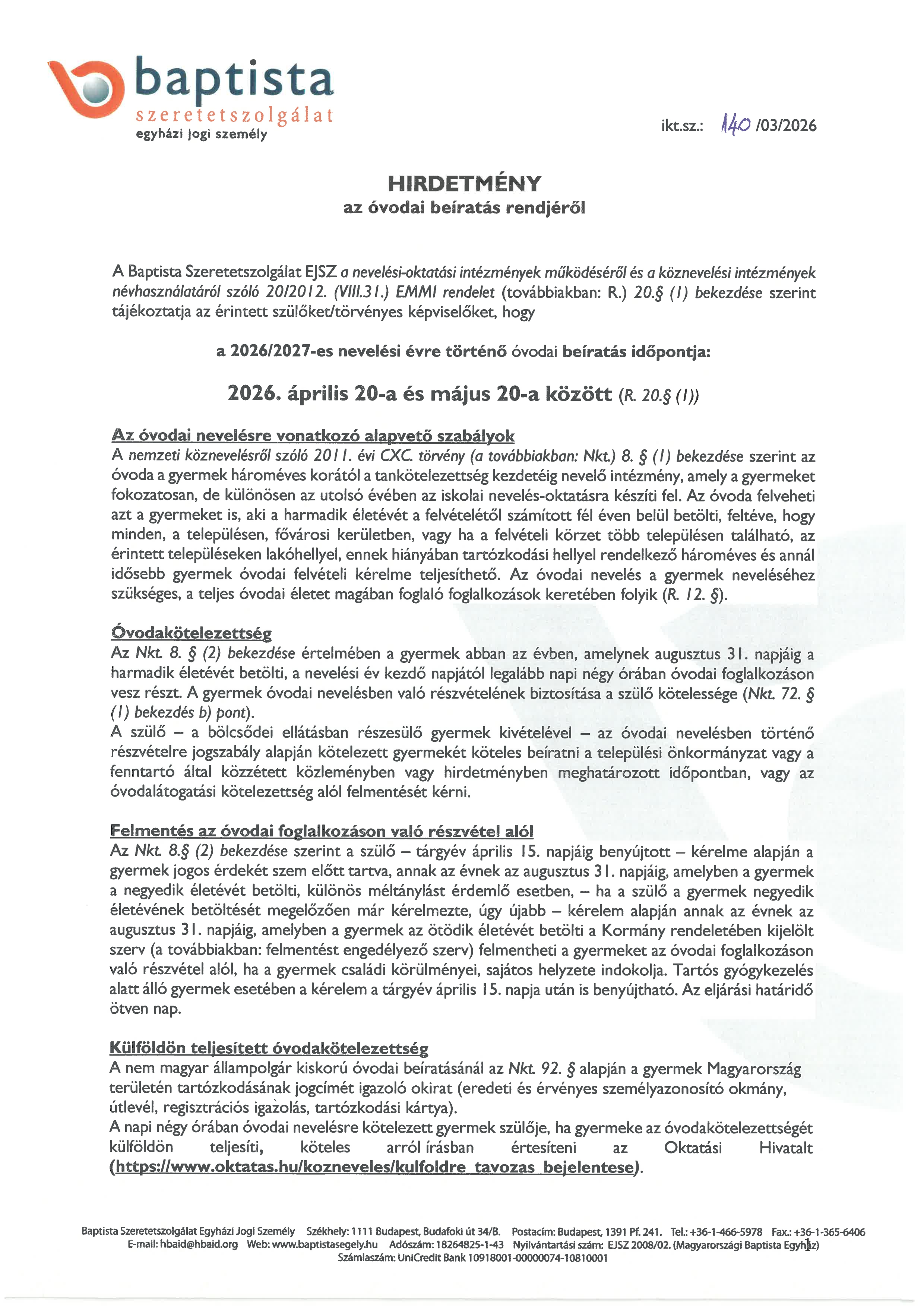 Ezúton is továbbítjuk a lakosság felé a Baptista Szeretetszolgálat 2026/2027-es nevelési évre vonatkozó tájékoztatását az óvodai beiratkozás rendjéről.