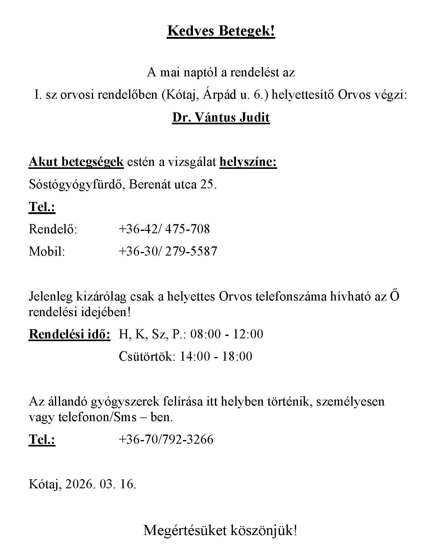 Tájékoztatjuk községünk lakóit, hogy az I. sz. orvosi rendelő ellátása ámenetileg helyettesítő orvos közreműködésével valósul meg!